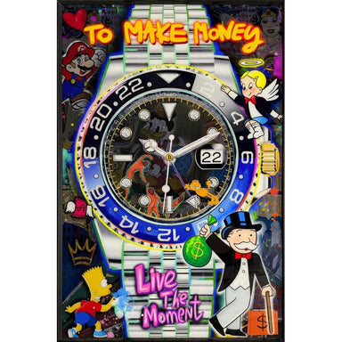 $100 Money Men' Artwork framed in a black frame with gold trim insert. Finished in high gloss with applied texture. Overall measures 160cm x 70cm