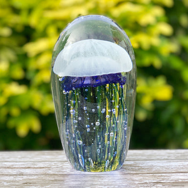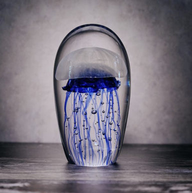 Hand blown glass Paperweight with Blue Jellyfish design. This item has a height of 17 cm, a width of 10 cm, and a diameter of 10 cm.