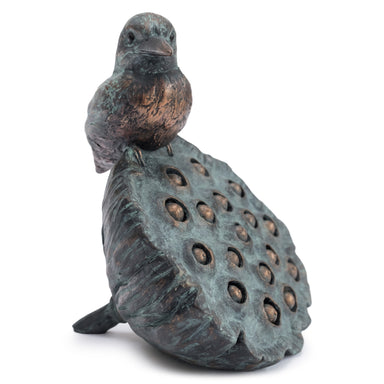 A Charming sculpture of a Kingfisher perched on a Lotus flower Dimensions: H 22cm W 17cm D 16cm Hand Painted Polyresin figures
