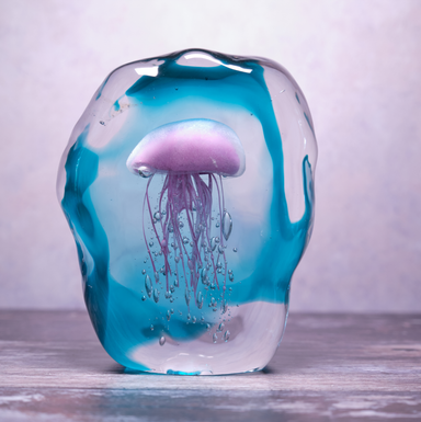 Hand blown glass Paperweight with a Pink Jellyfish design, in Blue Glass with a clearer Ice effect. This item has a height of 10 cm, a width of 13 ...