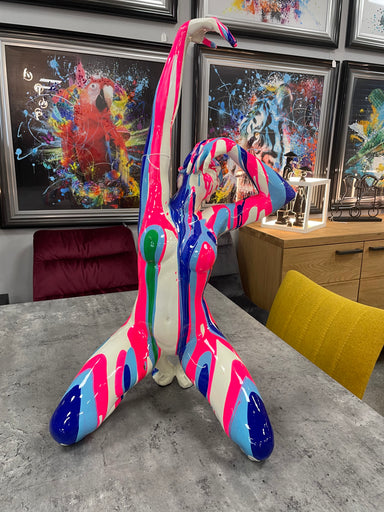 A large neon pink and blue striped resin statue of an attractive kneeling lady posing in a striking yet provocative pose. A truly outrageous piece ...