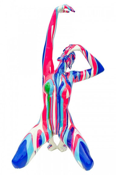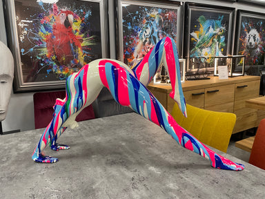 A large neon pink and blue striped resin statue of an attractive lady posing in a yoga or stretching exercise pose. A truly outrageous piece of mod...