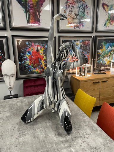 An extra large black, grey and ivory white striped resin statue of an attractive kneeling lady posing in a striking yet provocative pose. A truly o...