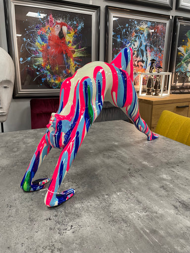An extra large neon pink and blue striped resin statue of an attractive kneeling lady posing in a striking yet provocative pose. A truly outrageous...