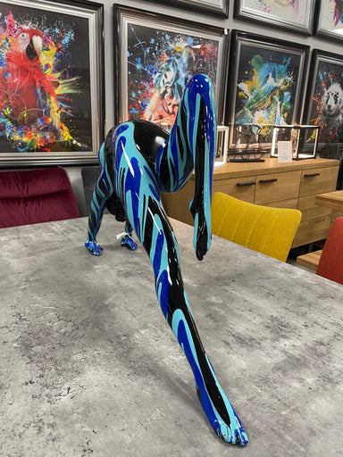 A large black and blue striped resin statue of an attractive lady posing in a yoga or stretching exercise pose. A truly outrageous piece of modern ...