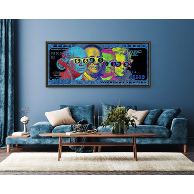 $100 Presidents' Artwork framed in a black frame with gold trim insert. Finished in high gloss with applied texture. Overall measures 160cm x 70cm