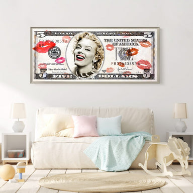 $5 Marilyn Kisses' Artwork framed in a silver frame. Finished in high gloss with applied texture. Overall measures 160cm x 70cm