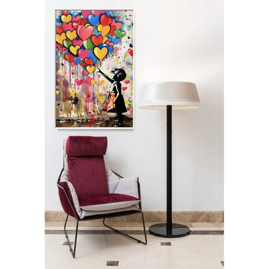 Girl with Balloons' Artwork framed in a white frame. Finished in high gloss with applied texture. Overall measures 80cm x 120cm