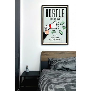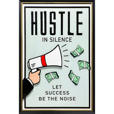 'Hustle' Artwork framed in a black frame with gold trim insert. Finished in high gloss with applied texture. Overall measures 60cm x 90cm