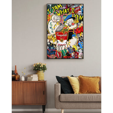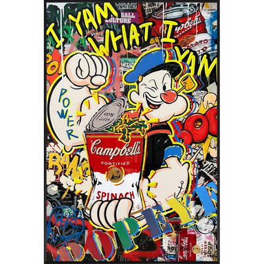 'I Yam what I Yam' Artwork framed in a black frame. Finished in high gloss with applied texture. Overall measures 80cm x 120cm