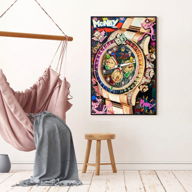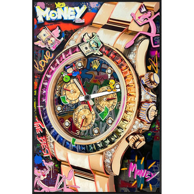 $100 Money Men' Artwork framed in a black frame with gold trim insert. Finished in high gloss with applied texture. Overall measures 160cm x 70cm