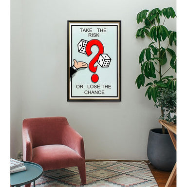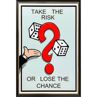 'Risk' Artwork framed in a black frame with gold trim insert. Finished in high gloss with applied texture. Overall measures 60cm x 90cm