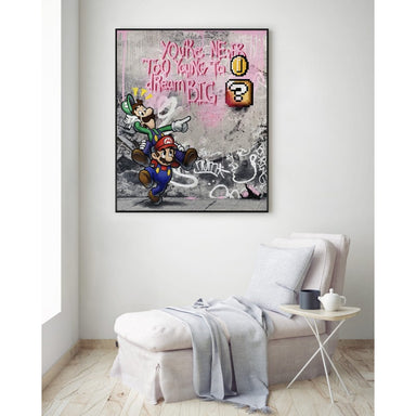 'You're Never too Young to Dream Big' Artwork framed in a black frame. Canvas finished in high gloss with applied texture. Overall measures 100cm...